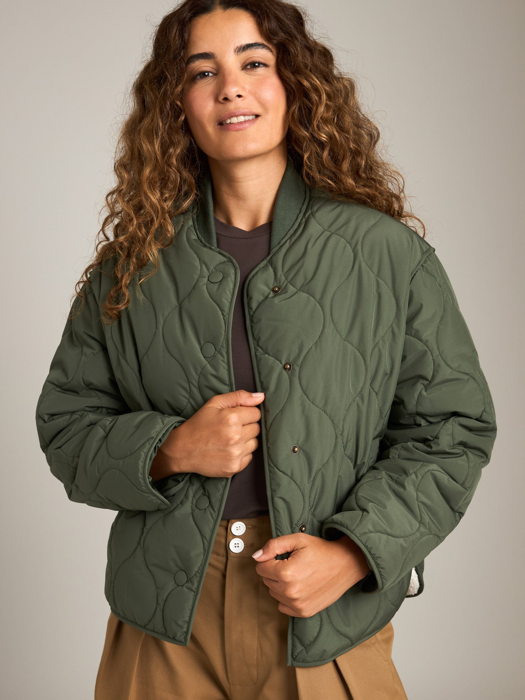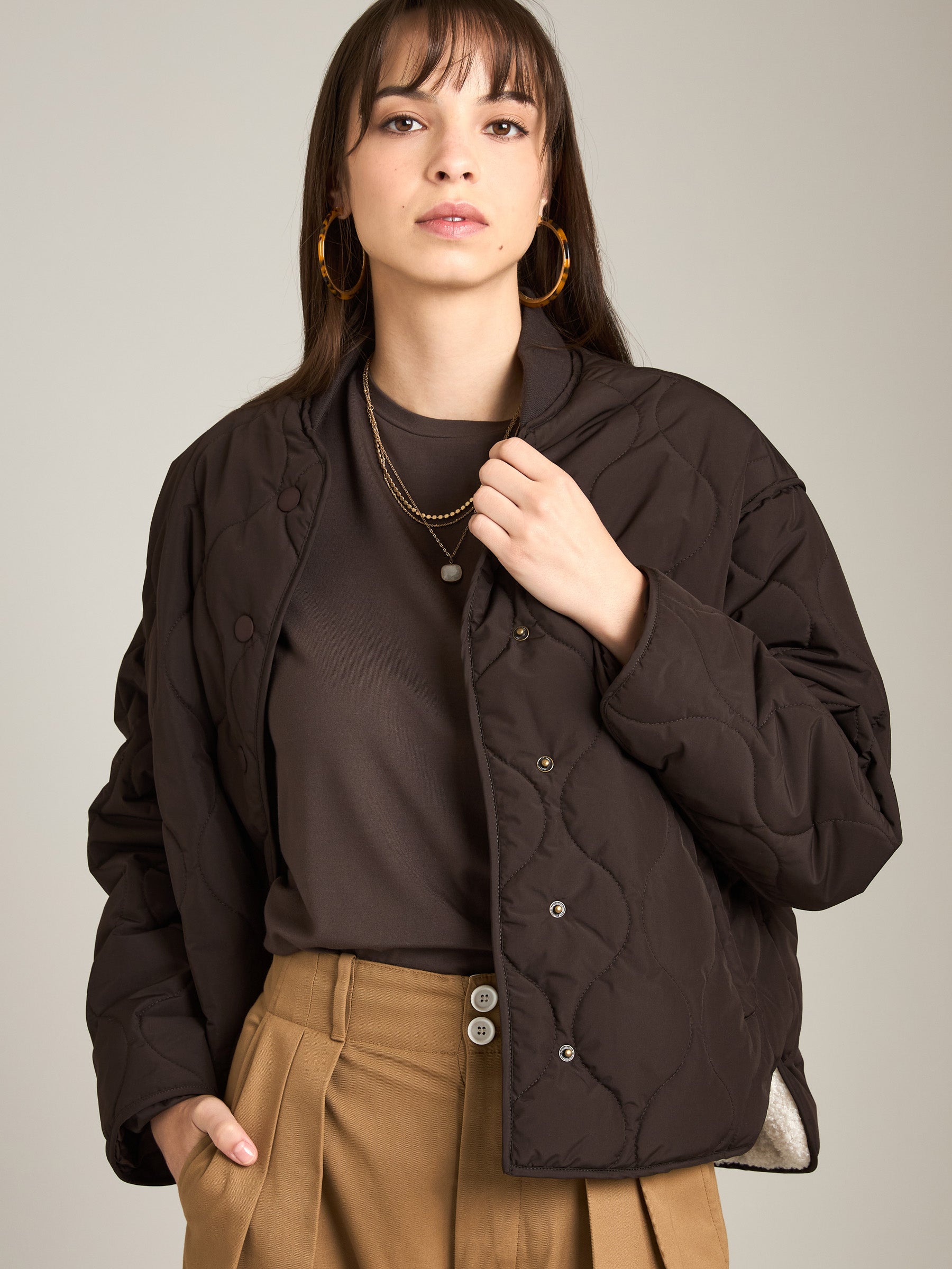 Stay cozy and layer up with the Monk & Lou Bailey Quilted Relaxed Bomber. Featuring an all-over quilted pattern, this sherpa-lined jacket sports a ribbed collar for laid-back style, while tonal snaps along the front create a uniform look.